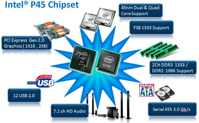 Le P45 est bien sur capable de gérer, officiellement, le FSB1600 et sera donc à même de pwner correctement n'importe quel processeur de la gamme Core sorti à ce jour (on le sait, vous êtes tous équipés en Qx9770, ne niez pas). Au niveau du contrôleur mémoire, le support de la DDR3 est bien sûr de mise; mais -et c'est vraiment stupide compte tenu du FSB supporté- ne se limite officiellement qu'au support de la DDR3-1333... Côté DDR2, là on progresse aussi un peu, mais pas trop, le support officiel grimpant jusqu'au DDR2-1066. Le XMP n'est pas pris en compte sur ce chipset (réservé à la gamme X).