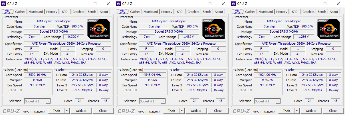 Voyons ce qu'il en est du Threadripper 3960X à présent. Il n'utilise "que" 24 cœurs actifs (config CCX 3+3) mais conserve le même TDP que son grand frère. De quoi gagner 100 MHz sur la fréquence de base face au 3970X. L'intégralité du cache L3 est disponible malgré la désactivation de 2 cœurs par CCD. Au repos la fréquence est identique entre les 2 Threadripper, en charge légère, le 3960X dépasse lui aussi les 4,5 GHz avec la même tension lue.