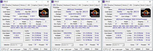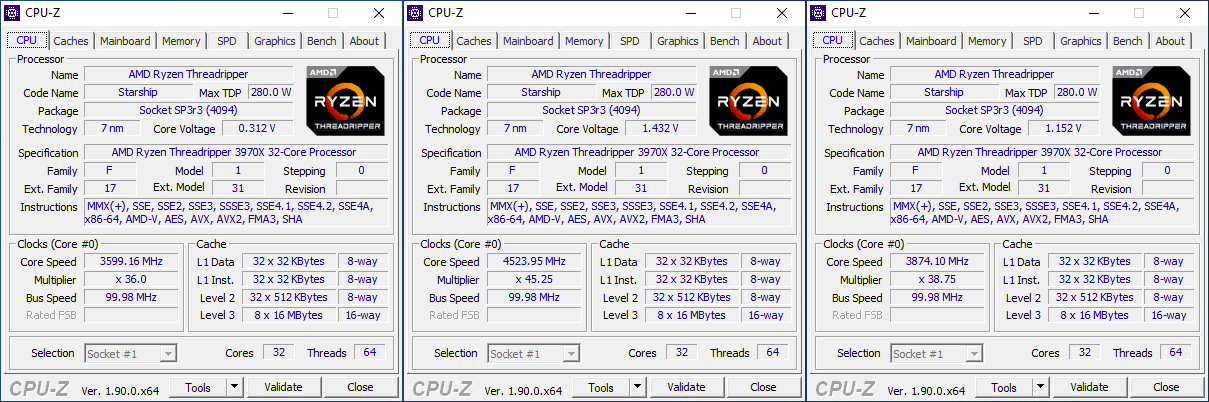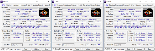 Voyons ce que CPU-Z peut nous apprendre sur nos processeurs en débutant par le 3970X. Le TDP officiel progresse de 30 W (à 280) par rapport au précédent CPU 32 cœurs des rouges. De quoi se donner de la marge pour maintenir des fréquences très élevées avec de nombreux cœurs sollicités. Les 128 Mo de cache L3 sont bien présents, ces Threadripper sont réellement des monstres côté caractéristiques. Quid des fréquences à présent ? Au repos, elle se limite à 3,6 GHz avec un vCore très faible. En boost, cette dernière peut dépasser très brièvement les 4,5 GHz officiels communiqués par AMD.