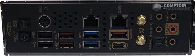 Du côté back panel, en sus des 2 ports USB 2.0 et 2 USB 3.0 (ou USB 3.1 Gen 1 ou USB 3.2 Gen 1 ! ), on trouve 4 ports USB 3.1 Gen 2, dont un utilisant un connecteur Type-C réversible. Tout ce beau monde est animé par le Z490. Les boutons clear CMOS et flash-BIOS en mode autonome/restauration pourront rendre de précieux services, tout comme le connecteur mini PS/2 mixte clavier/souris, pour ceux disposant de périphériques anciens. Côté réseau, un port RJ45 Gigabit Ethernet animé par la traditionnelle puce Intel i219-V, mais aussi un port 2.5G confié au bon soin d'une puce Realtek 8125B contrairement au choix d'ASUS (Intel). Le Wi-Fi 802.11AX (+BT 5.1) est par contre géré via le même tandem Z490 / CRF AX201. Quant à la partie audio, MSI l'a confiée aussi à un Codec Realtek ALC1220, accompagné cette fois d'un DAC ES9018Q2C d'ESS Technology. A noter également les perforations permettant l'aspiration d'air frais par le ventilateur dédié à refroidir le radiateur des VRM.