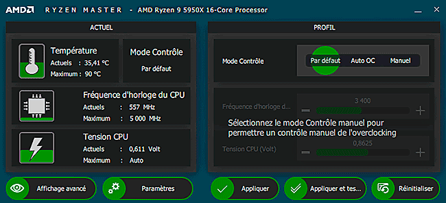 Concernant l'overclocking, AMD a décidé d'inclure cet été un mode simplifié à son excellent Ryzen Master. En effet, l'ajout régulier de fonctionnalités avait fini par le rendre complexe pour les néophytes. Ainsi, ce logiciel retrouve une simplicité d'utilisation enfantine, sans décevoir toutefois ceux désireux d'aller plus loin, via l'affichage avancé (identique aux précédentes versions).
