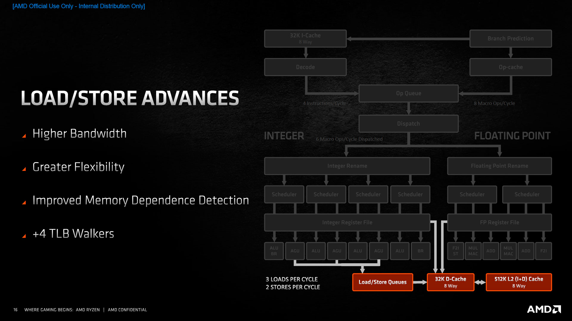 Pour transmettre les données du L1 à l’intérieur du cœur, AMD a dopé son sous-système mémoire. Rattaché à la partie s’occupant des calculs entiers (les chargements mémoire sont effectués à partir d’adresses, qui ne sont rien d’autre que des entiers 64 bits), ses bandes passantes explosent, avec la possibilité d’effectuer un chargement ou un rangement de plus par cycle, soit 3 opérations maximum, dont au plus 2 stores. Attention par contre, dans le cas d’utilisation des instructions AVX (utilisation de vecteurs de 256 bits), le processeur devra se contenter 2 chargements et 1 rangement, ce qui donnera des performances similaires à Zen 2. Du côté de la table des pages, les caches restent identiques avec un L2 à 2048 entrées, mais, surtout 4 page walkers supplémentaires, pour un total de 6. Ces composants servent à parcourir la mémoire allouée pour trouver la bonne entrée correspondante. Une évolution qui suit donc assez logiquement l’élargissement de la bande passante mémoire, et devrait masquer les latences dues aux accès chevauchant deux pages.