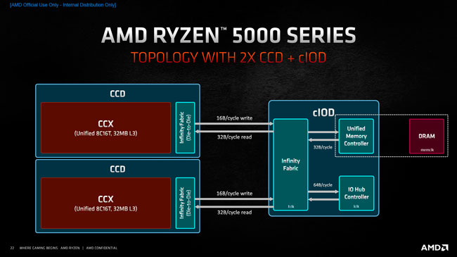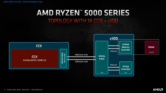 Au passage, la macro-organisation reste identique : un die nommé cIOD s’occupe des entrées/sorties et de la connexion entres cœurs de calcul regroupés au sein de dies nommés CCD, abritant chacun le CCX (à présent unique). Les CCD demeurent donc indépendants (permettant une meilleure granularité des coûts de production avec un seul type de die quelque soit le niveau de performance recherché), leur liaison avec le cIOD étant toujours confiée à l’Infinity Fabric, sauce Die-to-Die, c’est-à -dire en utilisant directement les couches conductrices du substrat. Cette non-innovation permet ainsi de conserver intact le cIOD, qui est toujours produit en 12 nm chez GlobalFoundries. Pour les processeurs qui nous intéressent aujourd'hui, l’AM4 reste de mise, et la compatibilité avec les chipsets série 500 et 400 assurée, si tant est que les fabricants mettent à jour les BIOS. Semi-déception pour les plus rêveurs, car cette série ne pourra pas pointer à plus de 16 cœurs sur le segment desktop, il vous faudra une fois de plus vous tourner vers les Threadripper pour cela.