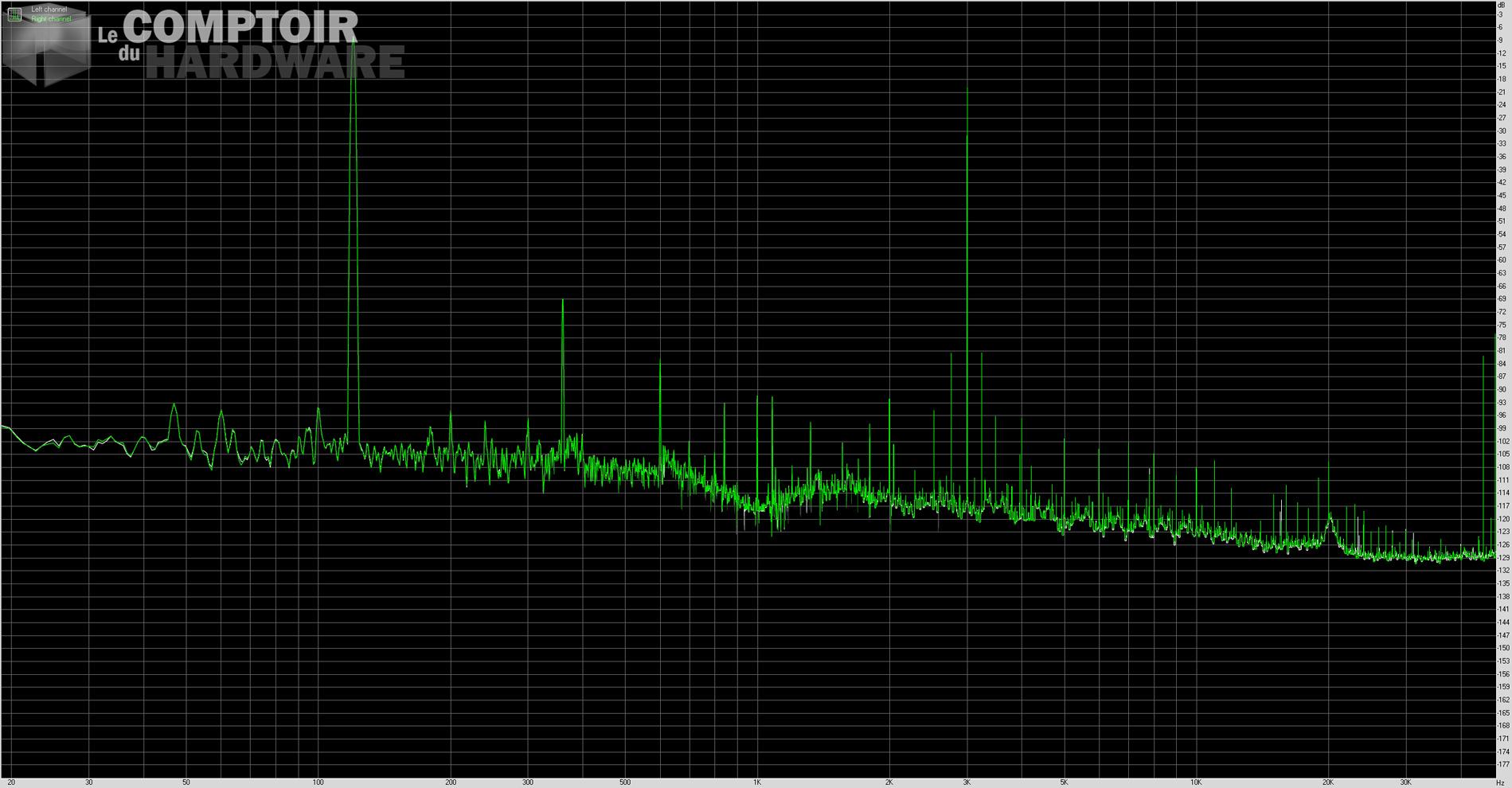 Comme de prévisible, les résultats ne sont pas flatteurs, que ce soit au niveau des chiffres ou des graphiques. Ainsi, le bruit, la diaphonie et le dynamisme lors de la reproduction en sont pas très élevés, ce qui risque de limiter fortement la distinction de certains instruments ou détails sonores de faible volume, et ce même si vous mettez le son de votre casque ou système son à fond. De même, si le THD reste correct, les harmoniques de haut rang sont assez présentes, ce qui rendra le son plus métallique et tranchant, et le taux d'IMD élevé risque de rendre très brouillons les orchestres de films ou les cinématiques dans les jeux vidéos.