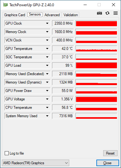 Au final, le gain atteint avec cet overclocking est d'environ 9% sous Cinebench R23, pour une consommation en hausse de 23 Watts (+ 24%) et une température progressant de 8 °C avec notre radiateur. Quid de la partie GPU à présent ? Il nous a fallu là aussi une augmentation la tension d'alimentation (1,25 V sélectionnés) pour parvenir à stabiliser le GPU à 2350 MHz.