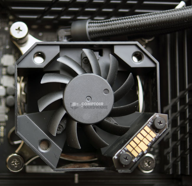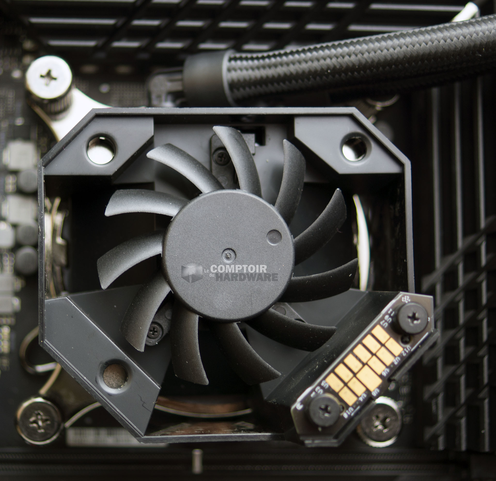 On découvre ainsi la présence d'un petit ventilateur au dessus de la pompe, ce dernier aidant au refroidissement des VRM de la carte mère et des modules M.2 à proximité, privés de flux d'air lors de l'utilisation traditionnelle d'un watercooling. Le flux d'air est canalisé à l'aide d'orifices dans le carénage recouvrant l'ensemble pompe + waterblock. Il a le bon goût de se montrer très discret. Une fois tout vissé, il ne reste plus qu'à repositionner le carénage, la fixation magnétique faisant le reste. À noter qu'un module permettant de raccorder jusqu'à 3 lignes ARGB et 4 ventilateurs 4 pins est livré avec les cordons ad hoc, son alimentation étant assurée par un connecteur SATA. Une fois tout ceci correctement connecté, le Ryujin II commence son spectacle.
