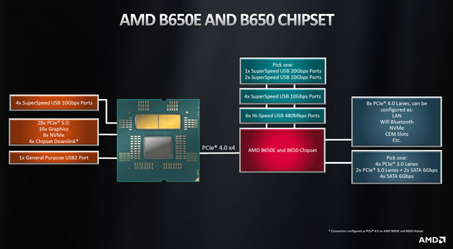Les B650 / B650E n'utiliseront de leur côté qu'une seule puce, ce qui réduira donc les possibilités de raccordement, mais également les prix par l'économie d'un chipset et un PCB moins complexe, et donc moins onéreux.