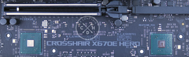 Avant d'aborder celle-ci, notons toutefois les avantages mis en avant par AMD, en particulier une simplification pour les constructeurs de cartes mères. Tout d'abord, les raccordements seraient facilités en positionnant astucieusement les 2 puces (évitant les pistes à rallonge jusqu'au chipset). Second point positif, la dissipation serait plus aisée, car chaque die consomme uniquement 7 watts, soit bien moins que celui du précédent X570 (~15 w). En les espaçant suffisamment, un simple radiateur est suffisant sans recourir à l'apport d'un ventilateur. À titre d'exemple, voici l'organisation des 2 puces composant le X670E, sur une Asus Crosshair X670E Hero.