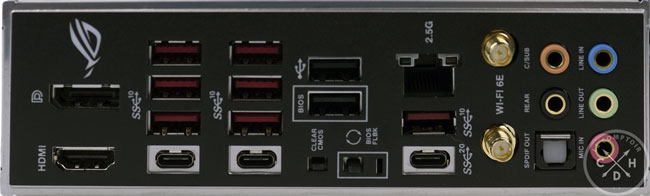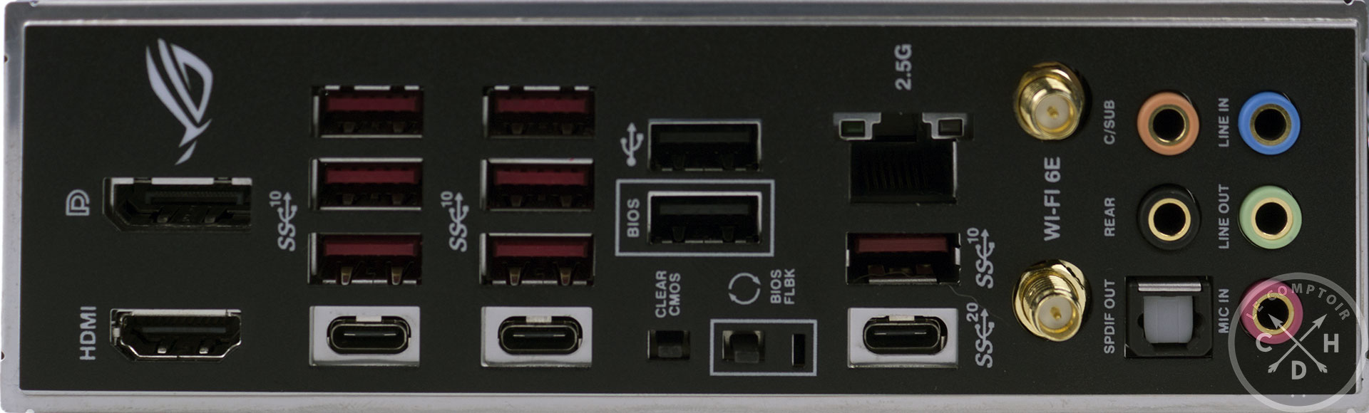 Du côté back panel, en sus de 2 ports USB 2.0, on trouve 9 ports USB 3.2 Gen 2, dont 7 utilisant un connecteur Type-A et 2 un Type-C . S'ajoutent enfin 1 port USB 3.2 Gen 2x2 Type-C. Un port HDMI et un DisplayPort constituent la dotation vidéo. Les boutons clear CMOS et Flash-Back en mode autonome/restauration, sont également présents et pourront rendre de précieux services le cas échéant. Côté réseau, on trouve un port Ethernet RJ45 2.5 Gbps animé par une puce Intel I225-V, ainsi que les ports antennes pour le module Wi-Fi 6E (RZ616) de Mediatek (rebadgé AMD suite à un accord entre les 2 groupes), permettant un débit théorique de 2,4 Gbps, sur la bande de fréquences des 6 GHz. ASUS a confié la partie Audio à un codec Realtek ALC4080, accompagné de condensateurs "premium".