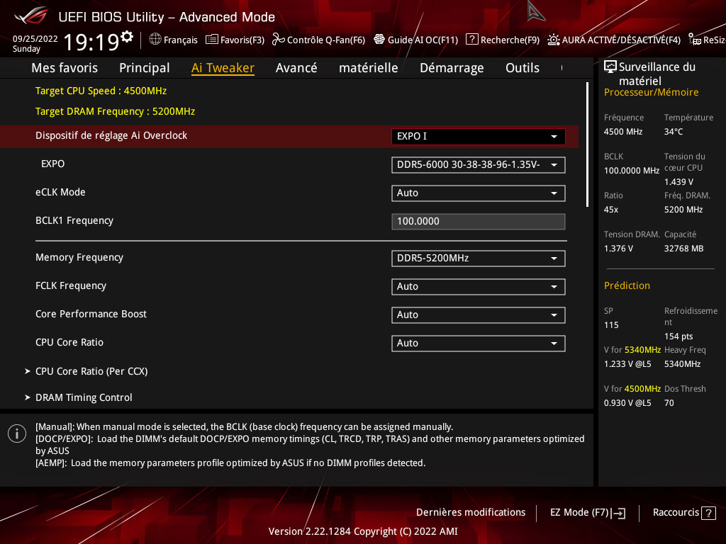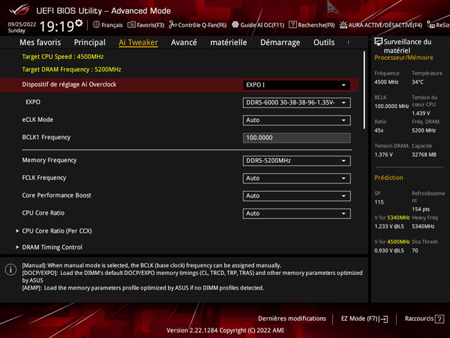 Pour finir, jetons un rapide coup d’œil à l'interface graphique de l'UEFI concoctée par le constructeur. C'est en territoire bien connu à présent que l'on s'aventure, le mode EZ (Easy) rappelant l'essentiel, même si l'on se retrouve très vite limité. Bon point pour les anglophobes, ASUS a traduit son interface en français, même si c'est parfois partiel ou approximatif.