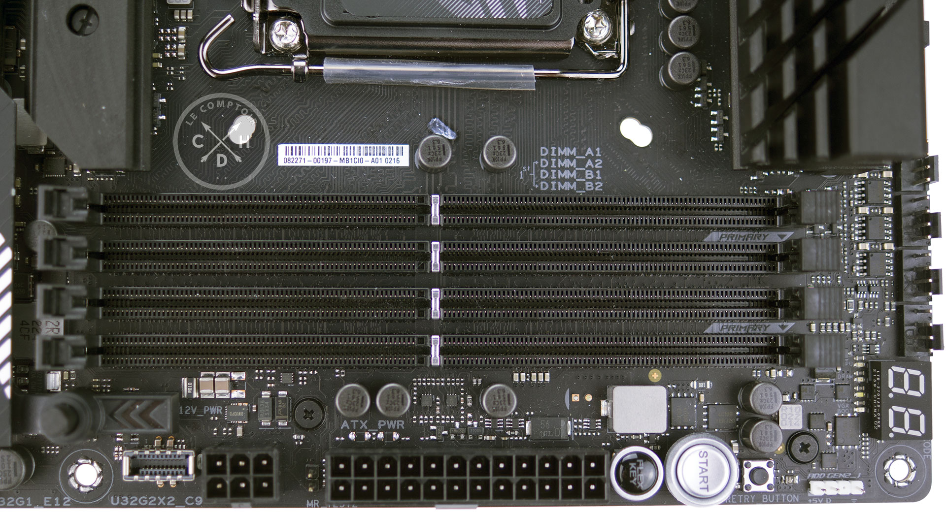 Du côté de l'alimentation, un traditionnel connecteur à 24 broches complété par deux connecteurs ATX 12V à 8 broches. À noter qu'un connecteur type PCIe à 6 pins est également présent, il permet de fournir de la puissance au connecteur interne USB 3.2 Gen 2x2 situé juste à côté. Un port USB Type-C frontal raccordé par ce biais peut délivrer une Quick Charge 4+ allant jusqu'à 60 W. Il vous faudra pour cela un boîtier doté d'une connectique prévue pour supporter au moins 3A. Sur la photo, on peut également distinguer les slots DDR5, ainsi qu'un des 3 connecteurs ARGB (complété d'un spécifique Aura). Enfin, l'afficheur LED à segments indiquant les codes POST ainsi que les boutons de démarrage / retry, prennent également place dans cette zone.