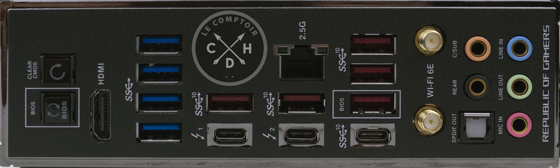 Du côté back panel, en sus de 4 ports USB 3.0 (3.2 Gen 1) animés par le Z790, on trouve 5 USB 3.2 Gen 2 utilisant un connecteur Type-A. S'ajoutent 2 ports Thunderbolt 4 Type-C capables de faire transiter les flux vidéo DP 1.4 et disposant d'une bande passante de 40 Gb/s. Le troisième connecteur Type-C se "contente" de son côté de 10 Gb/s. Enfin, un port HDMI complète la dotation vidéo. Les boutons clear CMOS et Flash-Back en mode autonome/restauration sont également présents et pourront rendre de précieux services le cas échéant. Côté réseau, on trouve un port Ethernet RJ45 2.5 Gbps animé par une puce Intel I226-V accompagnée d'un module Wi-Fi 6E des Bleus. ASUS a confié la partie audio à un codec Realtek ALC4082, accompagné de condensateurs de haute qualité spécialisés pour un usage audio, et d'un DAC à 4 voies ESS ES9218.