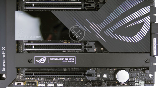 Les incontournables LED sont bien entendu présentes sur ce produit ROG. Elles se limitent par contre à une zone à la finition miroir au-dessus du panneau arrière de connexions. Asus réutilise ici ce qu'il nomme le Polymo Lighting, constitué de plusieurs couches de matériaux réflecteurs qui vont donner une sensation de profondeur au rétroéclairage assuré par des LED situées en périphérie. C'est moins clinquant qu'un écran LCD ou OLED, mais probablement bien plus fiable et tout aussi esthétique pour les amateurs. Les plus observateurs auront probablement repéré le gros bouton noir en bas à gauche. Ce dernier permet de libérer le loquet de verrouillage du port PCIe x16 à proximité du CPU, souvent très difficile d'accès lorsqu'un refroidisseur CPU conséquent et une carte graphique longue sont utilisés. Une excellente idée que voilà.
