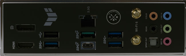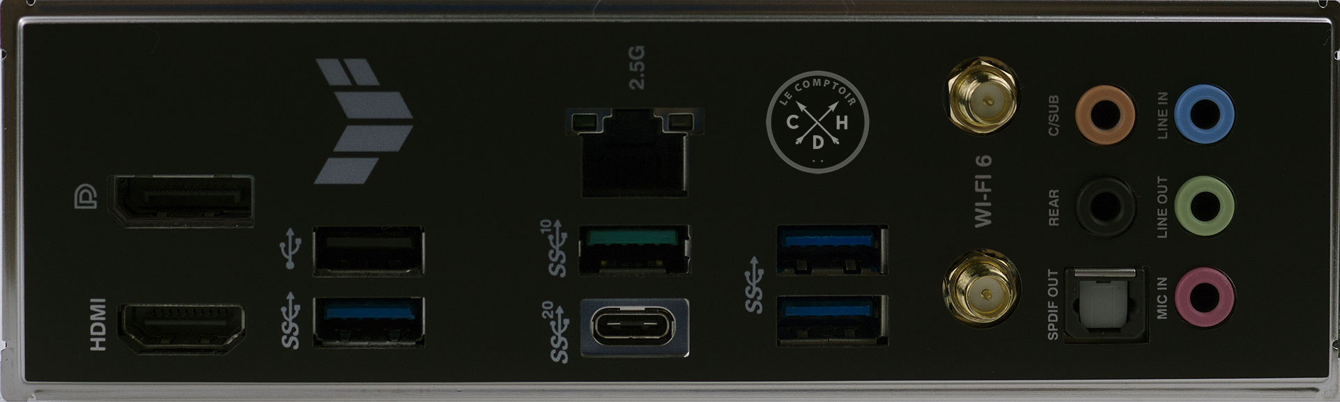 Du côté back panel, se trouve 1 ports USB 2.0, trois USB 3.2 Gen 1 et un USB 3.2 Gen 2 (10 Gbps). Il utilisent tous un connecteur Type-A, à contrario de l'unique USB 3.2 Gen 2x2 (20 Gbps) qui s'appuie sur un Type-C. Un port HDMI et un DisplayPort constituent la dotation vidéo. Côté réseau, on trouve un port Ethernet RJ45 2.5 Gbps animé par une puce Realtek 8125 accompagnée d'un module Wi-Fi 6 des Bleus. ASUS a confié la partie audio à un codec Realtek accompagné de condensateurs de haute qualité spécialisés pour un usage audio.