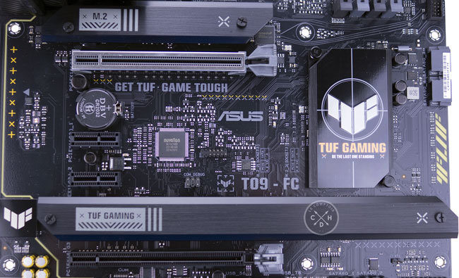 Les incontournables LED sont bien entendu présentes sur ce produit TUF. Elles se limitent ici à la zone jaune à côté des 2 ports SATA. Du côté de l'alimentation, un traditionnel connecteur à 24 broches complété par deux connecteurs ATX 12V : un à 8 broches et le second à 4. À Sur la photo, on peut également distinguer les slots DDR4, ainsi que deux connecteurs interne USB 3.2 : un Gen 1 et un Gen 2. Pas d'afficheur à segments indiquant les codes POST ici, mais des LED précisant le niveau d'avancement du Boot.