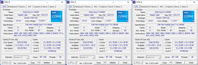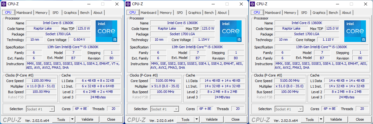 CPU-Z nous reporte un TDP officiel fixé à 125 W, mais cette valeur s'entend hors turbo actif. Avec ce dernier, le Core i5-13600K pourra absorber jusqu'à 181 W officiellement. On retrouve la configuration asymétrique constituée de 6 cœurs performances dotés d'hyperthreading et 8 cœurs efficients dépourvus de ce dernier. Chaque coeur est à présent doté de 2 Mo de cache L2 comme précisé page précédente, Ils se partagent également 24 Mo de cache L3. Ces valeurs sont donc en hausse par rapport à la génération précédente. Côté fréquences, le CPU va descendre jusqu'à 800 MHz au repos, même si notre Windows s'est montré un peu capricieux pour permettre la capture avec CPU-Z de cette fréquence sur les P-Cores (bloquant à 1100 MHz la plupart du temps). En charge, 5,1 GHz vont être atteints sur les cœurs performance et conservés quelque soit le nombre de cœurs sollicités.