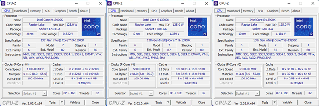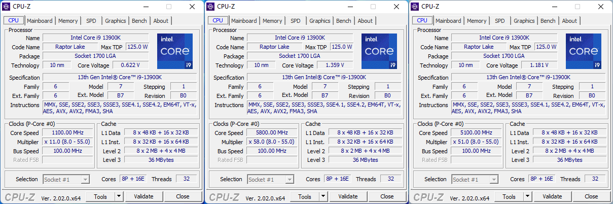 Fréquences du Core i9-13900K (Repos, 1 cœur actif, tous cœurs actifs)