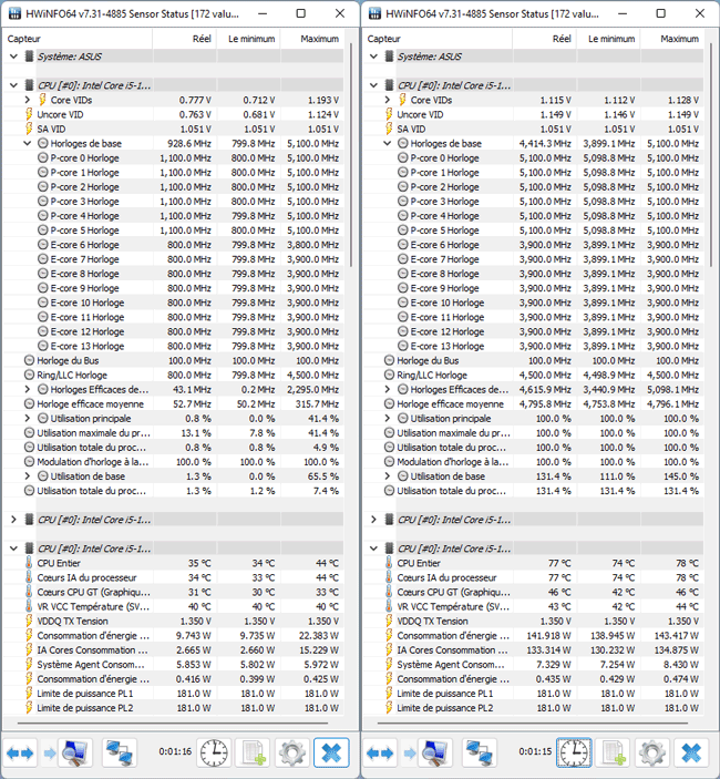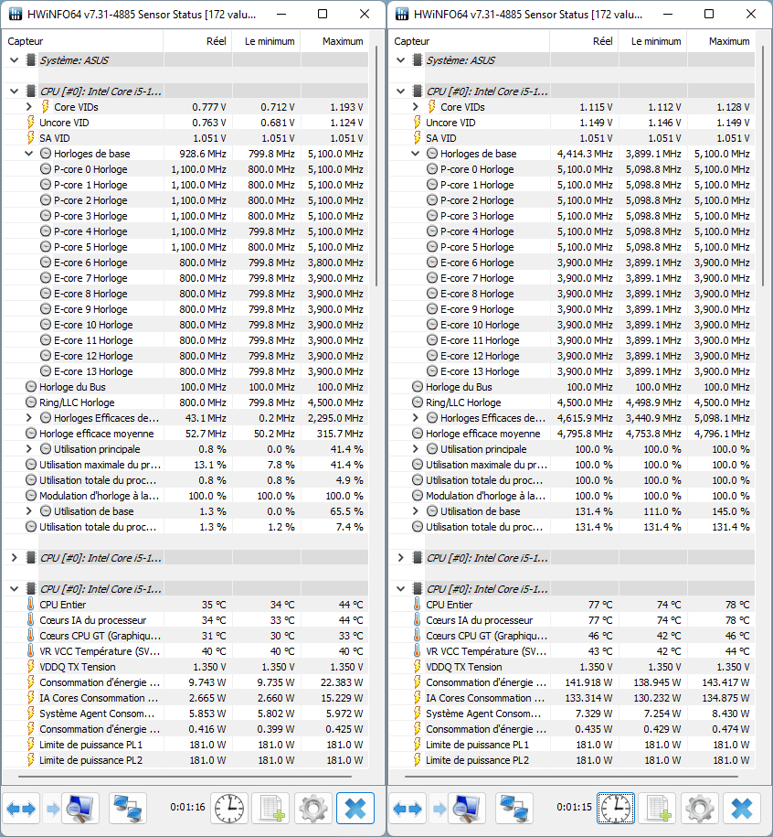 En utilisant HWiNFO64, il est possible d'avoir une vue d'ensemble du processeur. Comme attendu, les cœurs efficients "plafonnent" de leur côté à 3,9 GHz, et on constate que la limite de puissance est loin d'être atteinte avec un maximum légèrement supérieur à 143 W, selon la valeur reportée par la sonde.