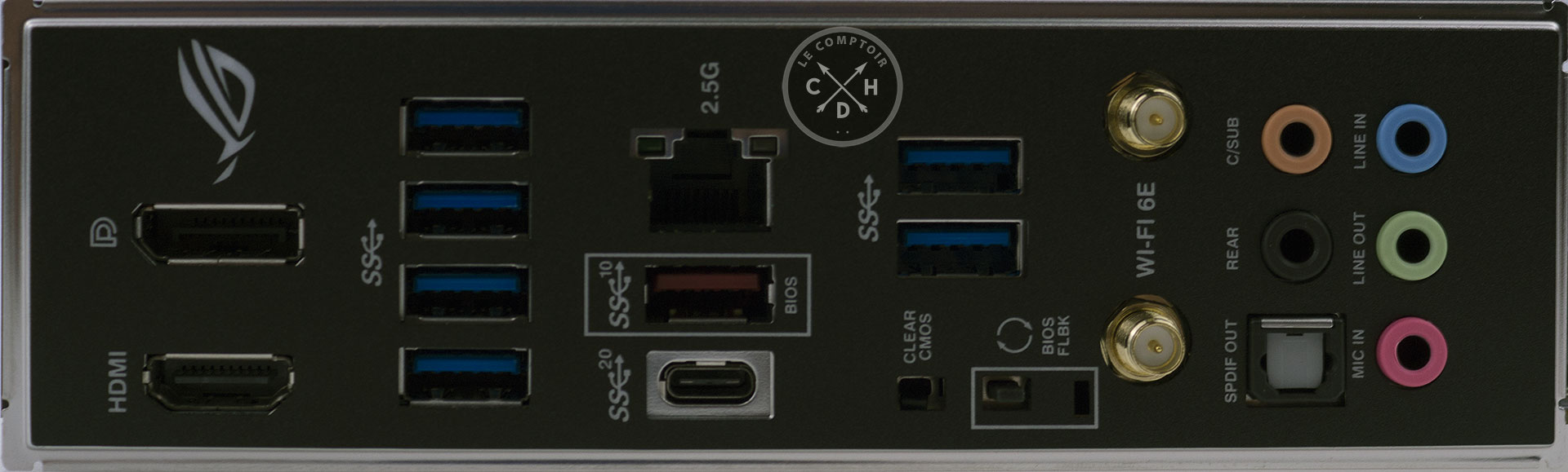 Du côté back panel, on dénombre pas moins de 6 ports USB 3.2 Gen 1 animés par le B760, accompagnés d'un USB 3.2 Gen 2, tous utilisant un connecteur Type-A. S'ajoute un port USB 3.2 Gen 2x2 via un connecteur Type-C cette fois. Un port HDMI et un DisplayPort constituent la dotation vidéo. Les boutons clear CMOS et Flash-Back en mode autonome/restauration sont également présents et pourront rendre de précieux services le cas échéant. Côté réseau, on trouve un port Ethernet RJ45 2.5 Gbps animé par une puce Intel I226-V, accompagnée d'un module Wi-Fi 6E. ASUS a confié la partie audio à un codec Realtek ALC4080 et d'un amplificateur pour prise casque Savitech SV3H712.