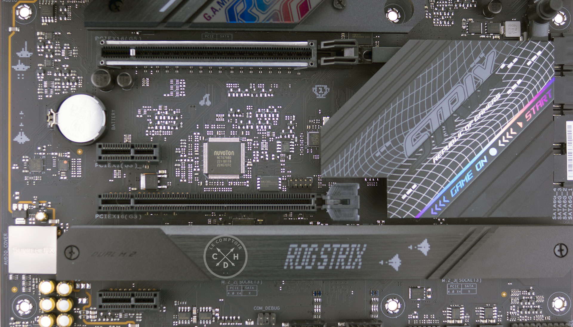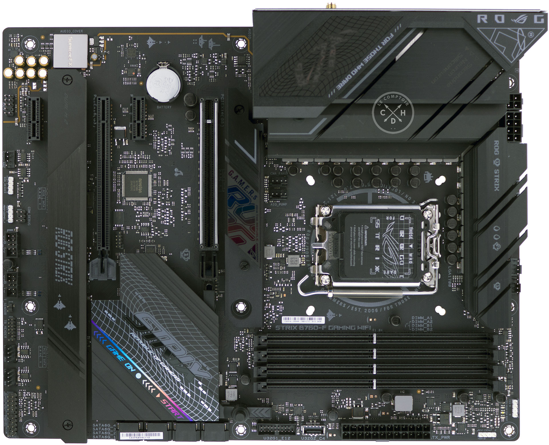 Après quelques mois, Intel propose une alternative moins onéreuse à son Z790, par le biais du B760 qui se voit amputé de quelques lignes PCIe et USB. Voyons ce qu'il en est d'une première carte mère utilisant ce nouveau chipset B760. Il s'agit d'un modèle haut de gamme, puisque faisant partie de la série Republic Of Gamers. Comme l'immense majorité des cartes mères, cette ROG Strix arbore un PCB noir au format ATX, ainsi que des radiateurs dans les mêmes nuances. Elle comprend 4 connecteurs d'extension PCIe, dont deux au format x16. Le premier est câblé via les 16 lignes 5.0 en provenance du CPU, le second peut utiliser jusqu'à 4 lignes à la norme 3.0 du chipset. (x2 si utilisation simultanée d'un ou des ports x1).