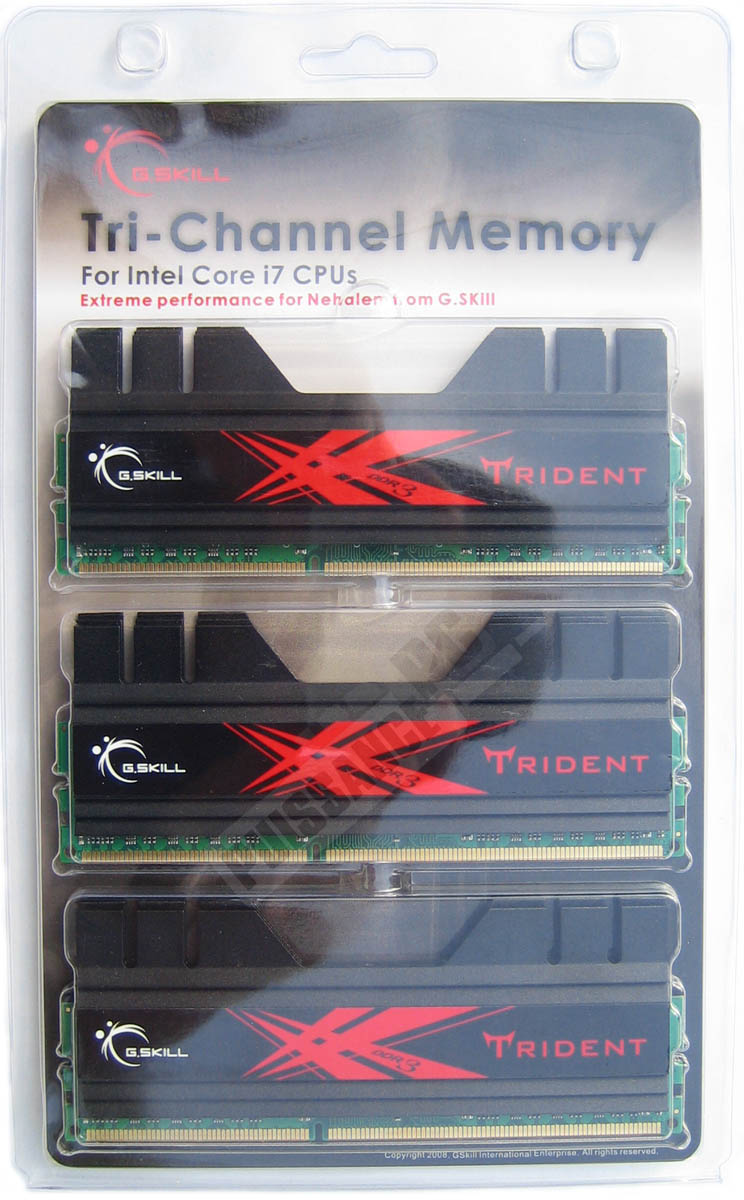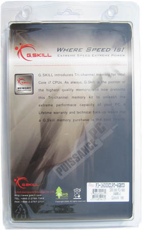 G.Skill est une société qui a apporté il y a quelques années une saine et franche concurrence face aux Corsair et autres OCZ dans le domaine des barrettes hautes performances. En effet pour un prix bien plus modique, il n'était pas rare de pouvoir acquérir un kit G.Skill n'ayant rien à envier à ceux des marques concurrentes bien plus onéreuses. Bien sûr, ces dernières ont depuis réagi en alignant la plupart de leurs tarifs sur cette nouvelle concurrence, reste que G.Skill s'est depuis forgé une réputation de qualité et de rapport performance/prix tout à fait justifiés. Nous avons retenu pour ce test le kit G.Skill Extreme 3 Trident séries de 6 Go en PC3-16000 soit 2 GHz. Ce dernier est bien sûr constitué de 3 barrettes de 2 Go pour atteindre les 6 Go de DDR3, qui plus est, il fait partie de la gamme Trident embarquant un refroidisseur particulièrement original comme nous le verrons plus bas. Débutons tout d'abord par l'emballage du kit :