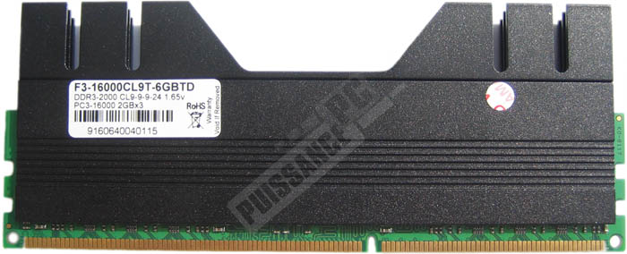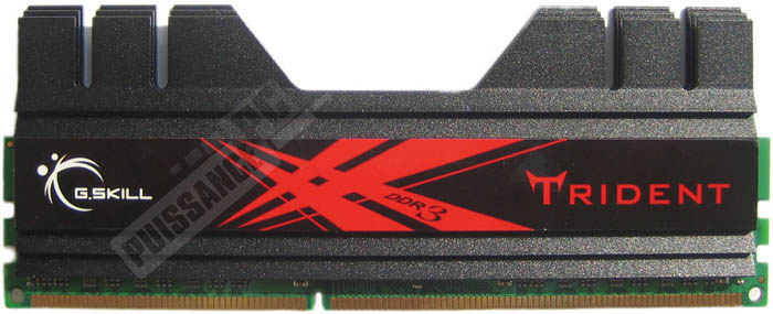 Le radiateur en aluminium noir adopte une forme pour le moins originale, les constructeurs rivalisant d'ingéniosité pour se distinguer les uns des autres. On regrettera comme trop souvent le PCB désespérément vert faisant "tache" au milieu de tout ce noir, pourquoi n'avoir pas poussé le côté design jusqu'au bout ? Au centre de ce dissipateur, G.Skill rappelle que l'on a bien affaire ici à de la DDR3 et à sa gamme Trident. Retournons le stick à présent comme une crêpe :