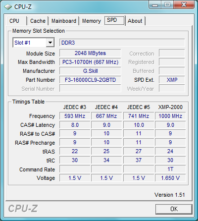 Passons à CPUZ afin de détailler le SPD de nos barrettes. Hormis les normes JEDEC dont seules les 3 dernières sont affichées, on retrouve le désormais traditionnel profil XMP sur les kits dédiés au Core i7. Ce dernier permet comme à l'accoutumée de dépasser les réglages plutôt conservateurs des profils JEDEC et évitera de régler manuellement chaque valeur correspondant à la désignation commerciale du Kit pour peu que l'option adéquate soit activée dans le bios d'une carte mère compatible. Avec 1,65V, la barrette pourra donc se cadencer en DDR3-2000 avec les timings 9/9/9/24, courants à une telle fréquence.