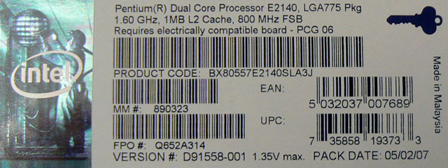 Prévu pour accepter 1.35V max selon les données officielles Intel, le Pentium E2140 reste gravé en 65nm, process maîtrisé depuis longtemps par Intel. Le modèle que nous avions était un modèle commercial, fabriqué en malaysie.