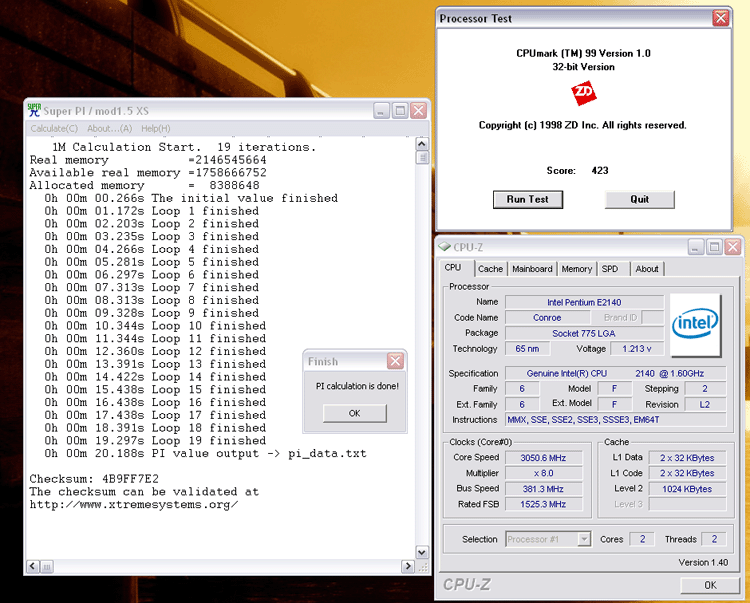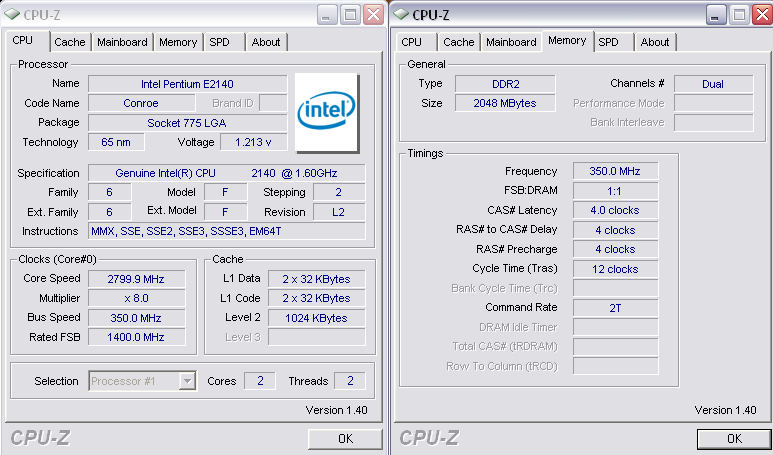Le Pentium E2140, qui sera cadencé à sa fréquence nominale de 1.6 GHz, puis overclocké à 2.4 GHz et 2.8 GHz. Pour le monter à 2.4 GHz , il n'a pas été nécessaire de toucher au Vcore, par contre, pour le monter à 2.8 GHz, il a fallu pousser la tension à 1.45V. Au maximum, à l'aide d'un excellent ventirad, il a pu atteindre 3050 MHz toujours à 1.45V. Vendu autour des 80 euros en version boîte.