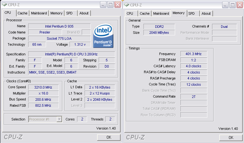 Le Pentium 4 D 935 core presler, 3.2 GHz et 2x2Mo de mémoire cache, basé sur la vieille architecture netburst. Ce processeur est également gravé en 65nm, et sa consommation est très élevée car son architecture est dérivée du core prescott, core à l'origine du déclin de pentium 4. Il est vendu aux alentours de 90 euros en version box