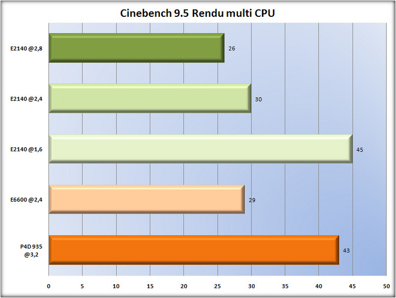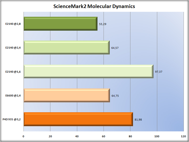 Analyse : Sur Cinebench,de base, le E2140 tient son aîné le D935 qui a une fréquence double, et quatre fois plus de mémoire cache. Cela prouve que l'architecture core est vraiment très bien pensée avec des latences extrêmement réduites. On remarque également qu'aux mêmes fréquences E6600 et E2140 se tiennent dans un mouchoir de poche, et à 2.8 GHz le E2140 est devant. Sur ScienceMark par contre, le E2140 est loin derrière le D935, ce qui montre que sa fréquence reste un élément castrateur. Une fois overcloké pas de problèmes, la hiérarchie des architectures et des fréquences est respectée.