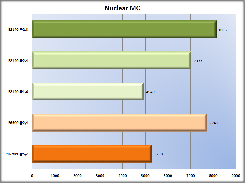 Analyse : Sur CrystalMark, le E2140 se paye le luxe de dominer encore une fois le vieillissant D935. Le manque de cache et sa petite fréquence ne semblent pas trop l'handicaper. Par rapport au E6600, par contre, et comme à chaque fois, c'est la raclée, compensée cependant par un overclocking raisonnable. A 2.4 Ghz les deux processeurs font quasi jeu égal. A 2.8 GHz, le E2140 se sent seul. Sur Nuclearus, le E2140 est à la peine, par rapport au D935, et dans une plus grande mesure au E6600. Pire, à 2.4 GHz, le E2140 reste assez en retrait, malgré une bande passante supérieure. Le petit cache de 1 Mo semble se payer cash ici. Même à 2.8 GHz, ce n'est que de peu qu'il reprend le dessus, avec 400 MHz de plus au compteur quand même.