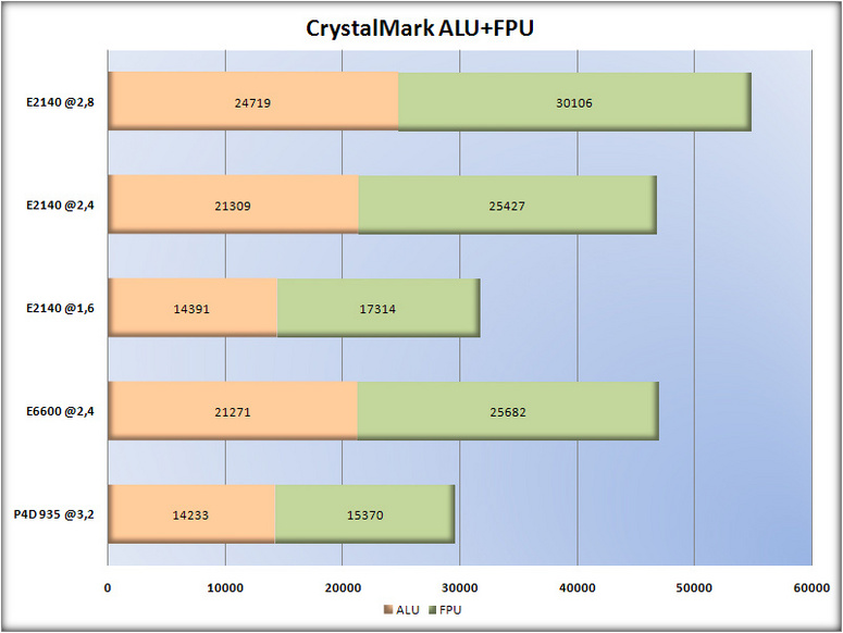 CrystalMark permet de jauger les processeurs sur les nombres entiers et en virgule flottante. Le score le meilleur est le plus élevé, ainsi dans le graphique qui suit, plus la barre va loin, et mieux c'est. Le score final qui n'apparait pas est la somme de l'ALU et de la FPU.
