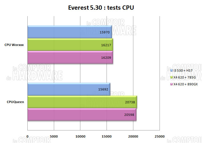 Voici les tests CPU intégrés à Everest, CPUQueen et CPU Worxxx. Ces derniers sont bien multithreadés, voyons comment l'Athlon II X4 620 est géré par les northbridge, et comment le Core i3 va compenser le remplacement de coeurs réels par deux simulés.