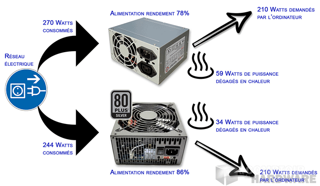 En résumé, si on imagine qu'une machine nécessite une puissance de 210W pour travailler, avec une alimentation d'un rendement de 78%, 270W d'électricité seront consommés, alors qu'avec une alimentation d'un rendement de 86%, elle n'en consommera que 244W.
