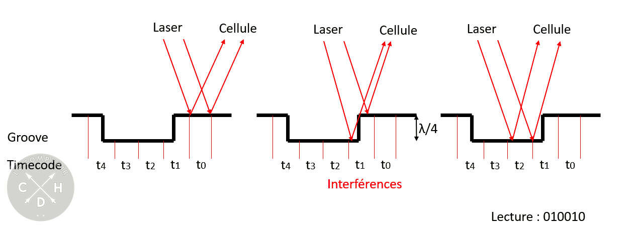 Quand le laser passe sur la surface ou le fond du pit, la réflexion est totale (on code un 0), mais quand le laser entre ou sort d’un pit, les interférences annulent le signal (on code un 1).