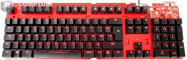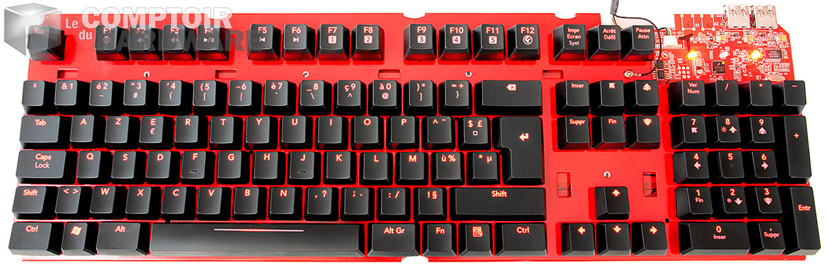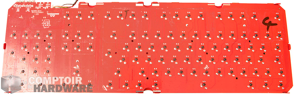 Une fois à oilp, on comprend un peu mieux l'embonpoint du KB-460 : une plage en ferraille rouge vient en effet recouvrir la quasi-totalité du PCB. L'intérêt est uniquement visuel, puisqu'il renforce le rétroéclairage en réverbérant la lumière des LEDs des switch via un fond rouge qui rend la couleur encore plus contrastée, offrant une sorte de sillon lumineux sous les touches; effet assez réussi du reste.
