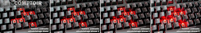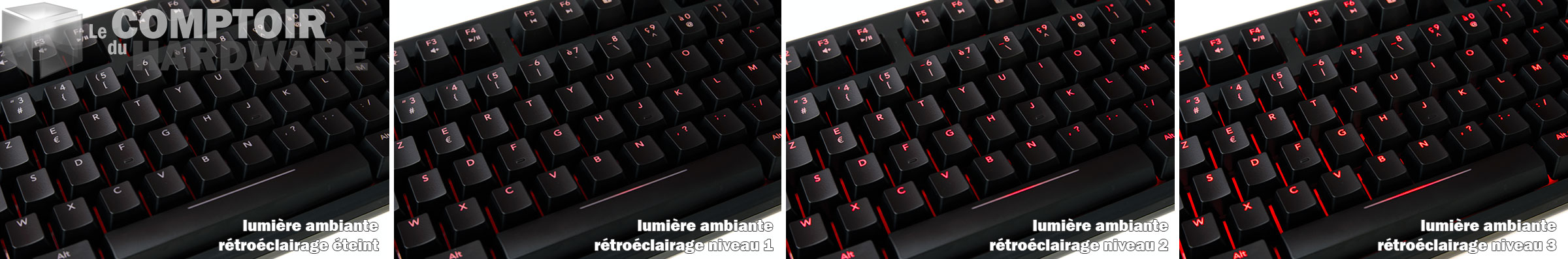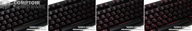 Le rétroéclairage complet sur toute l'étendue du layout n'est personnalisable que sur son intensité, selon 3 niveaux et un quatrième mode pulse conférant un effet de fondu in/out en cycle continu, genre respiration. À part sur la barre espace, s'agissant du rétroéclairage standard proposé par Cherry, peu de surprise là encore : il est efficace et forcément uniforme puisque chaque touche à sa propre LED, même si le premier niveau semble être anecdotique tellement il est faible. Dommage qu'on ne puisse pas personnaliser un layout où seulement certaines touches restent allumées, cela aurait donné un plus non négligeable au KB-460.