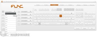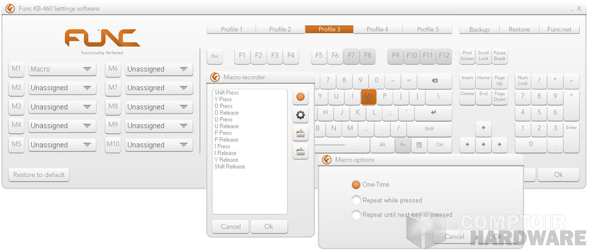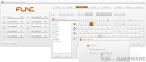 La partie logicielle est un peu à l'image du clavier dans son ensemble : ça présente bien, et ça fait le boulot, mais pas trop non plus. Vu la configuration du clavier, son installation est totalement falcutative. Elle sera néanmoins nécessaire pour jouer de la macro et réassigner les touches du clavier à votre convenance, jusqu'à 10 par profil (au nombre de 5) et uniquement en mode Func activé, rappelez-vous nous l'avions évoqué au début de l'article. En mode normal, point de tout ça.