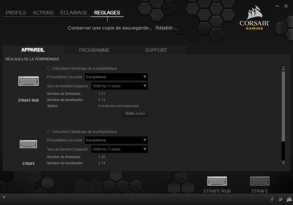 Si on veut vraiment personnaliser l'engin, c'est par là que ça se passe. Enregistrer une macro, ajouter des fonctions, régler un périphérique ou l'autre et enfin, faire mumuse avec les DEL. Il y a vraiment de quoi faire et une fois la chose prise en main, ça devient assez évident. Il ne faut pas avoir peur de balancer du clic droit de tous les côtés pour voir ce que cela fait, en général c'est par ce biais que vous pourrez ajouter des éléments (sauf lorsqu'un gros bouton "Ajouter" ou "Créer" est affiché). Le reste du logiciel est moins funky, mais permet tout de même quelques réglages intéressants en plus de permettre de gérer la mise à jour du firmware des différents appareils connectés.