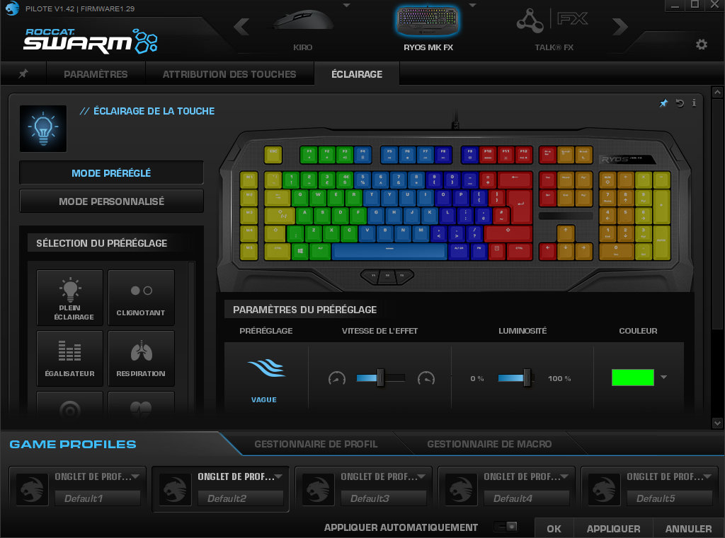 Le quatrième onglet est entièrement dédié à la gestion du rétroéclairage. Contrairement au Ryos MK Pro, des profils sont préconfigurés pour vous permettre de donner des effets divers et variés à votre appareil. Arc-en-ciel, vagues, effets à la frappe, égaliseur audio, tout y est, mais avec un prix comme on va bientôt le voir (long le suspens hein ?). Les deux captures suivantes vous présentent le gestionnaire des profils et celui des macros, qui en comprend un bon nombre pour un paquet de jeux plus ou moins récents.