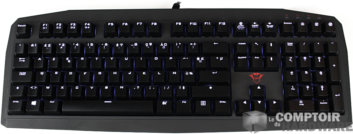 L'engin mesure 1475 mm de long, 168 mm de profondeur et 37 mm de haut. Il a un format relativement standard et sans fioritures (même pas de repose-poignet contrairement au GXT 850), mais le lecteur à l'oeil averti aura remarqué que la disposition des touches n'a rien d'habituel pour un clavier en AZERTY FR. En effet, c'est une disposition typique du QWERTY US, mais avec les touches et fonctions d'un AZERTY FR. La grosse touche entrée disparaît et l'écart entre les touches est modifié (sur la partie alphabétique). Ça mis à part (ce qui pourra déplaire à certains, mais plaire à d'autres), le clavier comprend quatre touches supplémentaires au-dessus du pavé numérique, une pour activer le "Game Mode" et trois pour la gestion du rétroéclairage. Les touches F1 à F4 pourront devenir des touches de macro (uniquement en mode jeu) et les touches "Impr. écran Syst", "Arret Défil." et "Pause Attn" serviront au réglage du son en association avec la touche Fn.