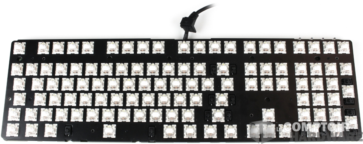 On retire les touches, on dévisse tout ce qui doit l'être et hop ! on a le PCB protégé par sa plaque en acier noir où l'on retrouve les fameux commutateurs GXT White du constructeur. C'est donc de la copie chinoise de Cherry MX Red avec rétroéclairage blanc. Ces engins font leur boulot et le ressenti tactile est proche de ce que fait Cherry, mais pour ce qui est de la sonorité, ça n'a rien à voir. On aurait pu féliciter Trust de ne pas avoir choisi d'opter pour des réglettes en acier sur ses touches les plus larges en collant à la place des commutateurs sans contact, mais ça n'est pas le cas. Ces petits commutateurs noirs sont en fait juste des ergos reliés à des réglettes en acier qui se trouvent sous la plaque en acier. Et que se passe-t-il lorsqu'on assemble de l'acier à du plastique et que l'on enferme le tout sous une plaque en acier ? Du bruit, que vous pourrez découvrir dans la vidéo page suivante. Associé à un châssis en plastique fin et plein de vide, l'engin pourrait presque rendre les MX Blue agréables à l'utilisation tant le bruit de vibration métallique qui accompagne la frappe est présent et désagréable.