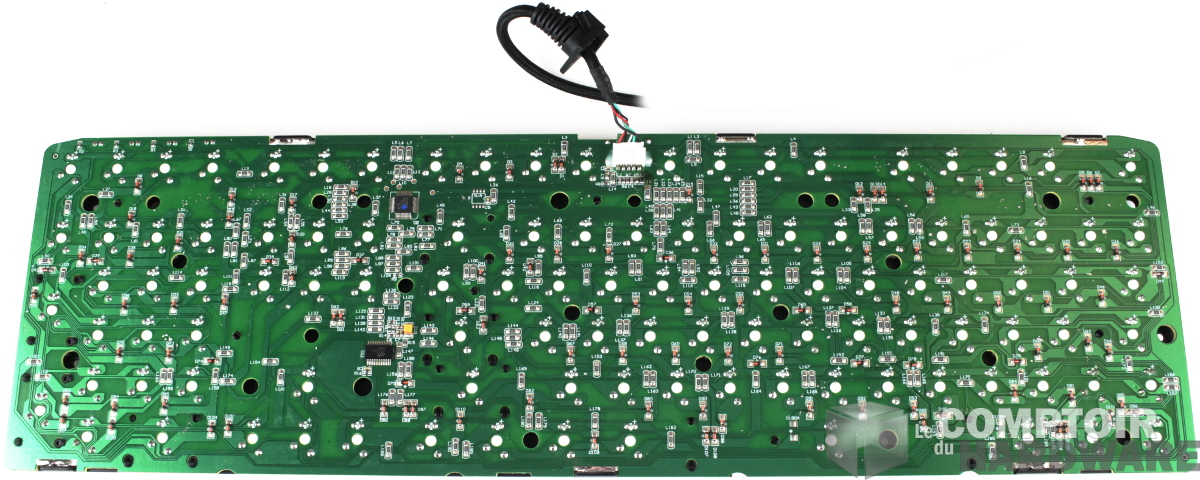 Une fois de dos, on peut jeter un oeil sur le PCB sur lequel Trust n'a pas mégoté. Ici les soudures semblent toutes de bonne qualité, les commutateurs sont bien fixés et à part le placement du câble USB (dont le connecteur aurait pu être renforcé) on a un tableau tout à fait convenable. Reste maintenant à voir le tout en action, ce que l'on se propose de faire page suivante.