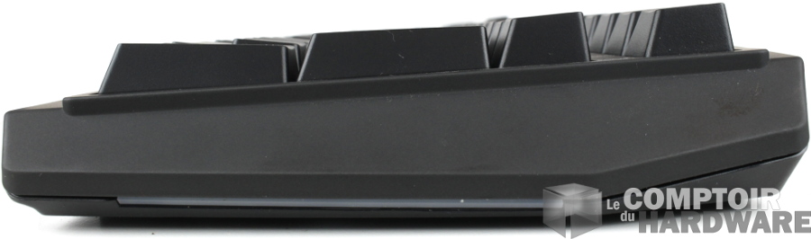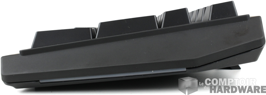 Vu de côté, pas de courbure des touches pour assurer une plus grande mobilité, on reste donc sur du modèle spartiate au possible. L'angle offert par les pieds dépliables est standard et, comme on l'a dit précédemment, ce centimètre gagné coûtera cher en stabilité sur le bureau. Allongé ou surélevé, ça sera en fonction des besoins de chacun, même si on vous conseille d'éviter de trop casser votre poignet pour ne pas avoir de problèmes de canal carpien dans le futur, surtout que ce modèle ne s'offre même pas de repose-poignet. Maintenant, démontons l'engin pour finir d'en faire le tour.