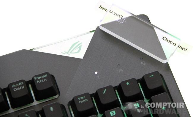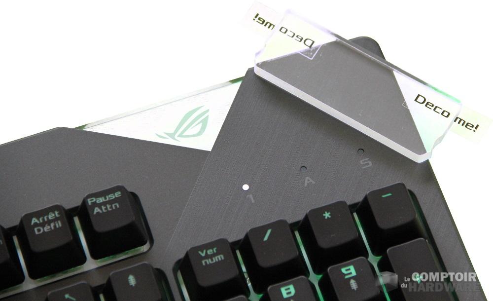 Pour les fans de customisation, la plaque sur le bord supérieur droit, arborant initialement le logo ROG, peut être remplacée (ASUS vous en fournit une vierge), un petit plus aux allures de gadget, certes ; mais pour personnaliser un clavier, difficile de faire beaucoup mieux.