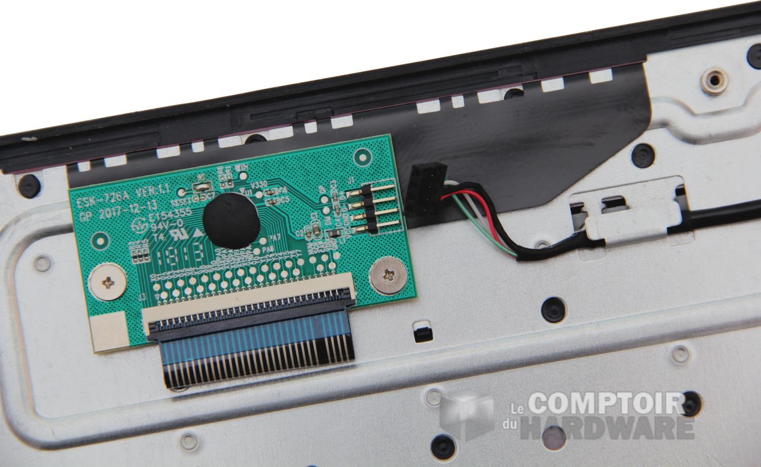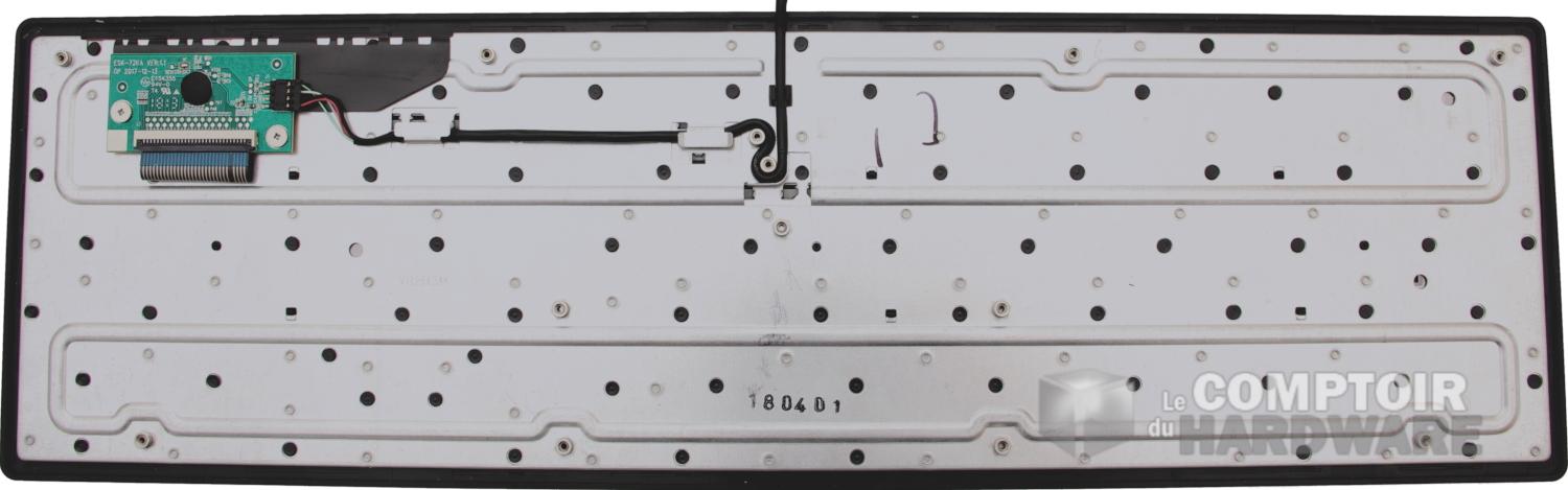 Pour les amateurs de dos nus, voici donc celui du KC 6000 Slim. Mis à part la microscopique carte pour contrôler le tout (sans éclairage ni macro programmable, pas besoin de bien grand !) et les bloqueurs du câble USB, pas grand chose n'est à noter. En cas de dysfonctionnement du câble, les plus aventureux pourrons tenter de le changer, la prise utilisée à 4 contacts étant relativement standard. Pour le reste, le métal est bien rigide, le nombre de plots amplement suffisant, et l'impression de qualité qui se dégage de l'ensemble n'en est que confirmée.
