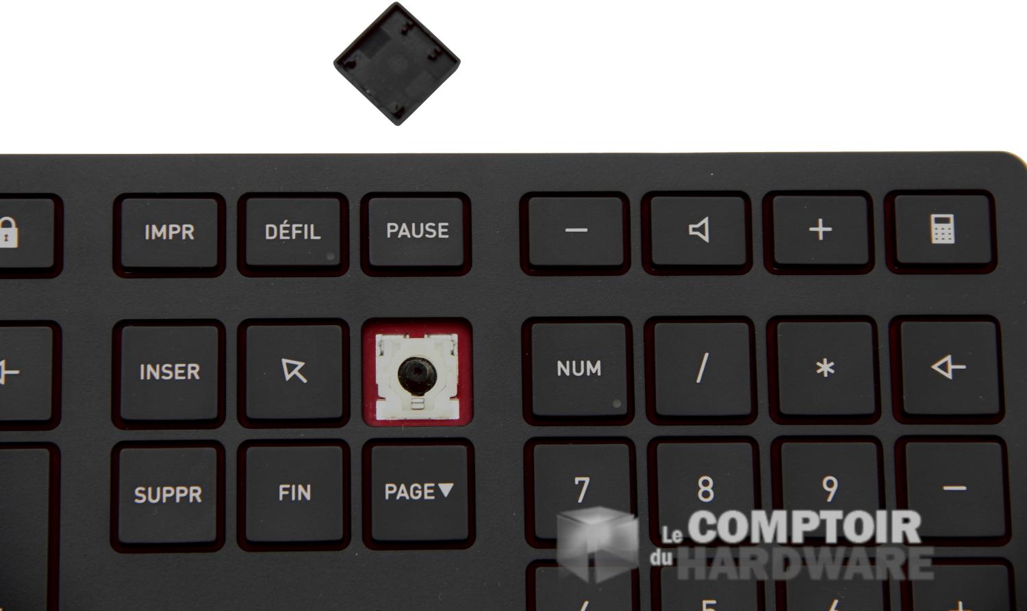 Les touches sont par contre solidement fixées par les mécanismes en ciseaux, rendant un démontage individuel quasiment impossible, et le remontage des plus ardus. Ce dernier se décompose assez classiquement en deux pièces plastifiées accrochées à la touche d'une part et au châssis de l'autre via huit encoches emprisonnant les pieds. La partie centrale du ciseau est également simplement clipsée, et ce sont ces minuscules trous qui seront les plus propices à une déformation lors du démontage. Le retour de la touche est quant à lui assuré par une membrane élastique ; rien de bien nouveau en somme !
