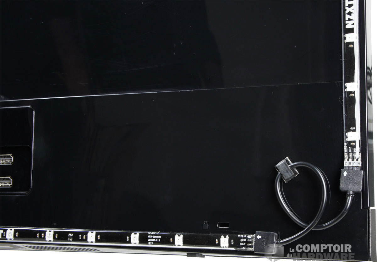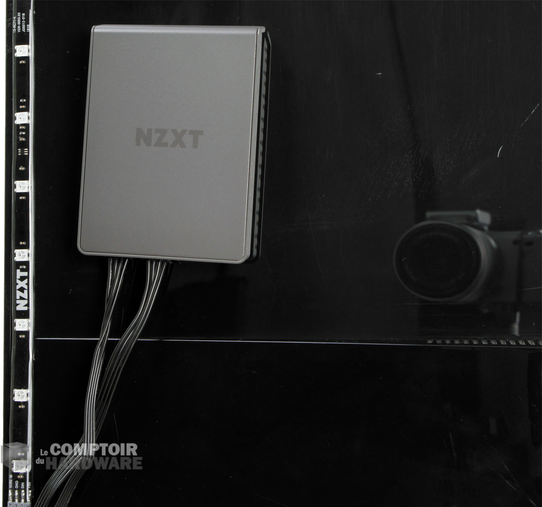 L'installation sera assez rapide puisqu'il suffit de coller les différents bandeaux derrière votre écran, à l'aide de l'adhésif 3M préinstallé sur ces derniers. Connectez les ensuite les uns aux autres avec les câbles de 150 mm prévus à cet effet et de raccorder le tout au boîtier de contrôle. NZXT a pris le soin d'écouter les critiques et de modifier la longueur des raccords, un poil trop courts initialement. Notez également que le 3M livré sur les premiers kits était d'assez mauvaise qualité et avait tendance à se décoller. Néanmoins, la marque a réagi rapidement et a corrigé le problème. Si ça n'est pas votre cas, une simple demande devrait suffire pour vous faire livrer un rouleau de 3M V2.