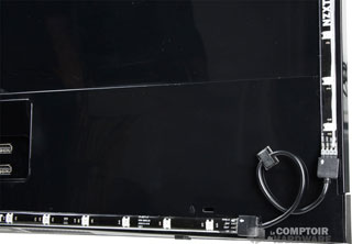 Concernant Ambient Lighting, le boîtier possède donc deux canaux RGB permettant de contrôler jusqu'à 4 bandes RGB chacun. Comme nous l'évoquons un peu plus haut, deux versions sont disponibles. La première est adaptée aux écrans de 21 à 26", livrée avec deux bandeaux LED de 300 mm, quatre de 250 mm et deux de 200 mm. Le second kit concerne les écrans de 27 à 35" et contient quatre bandeaux de 300 mm et quatre de 250 mm. Il n'y a rien de plus à dire ici